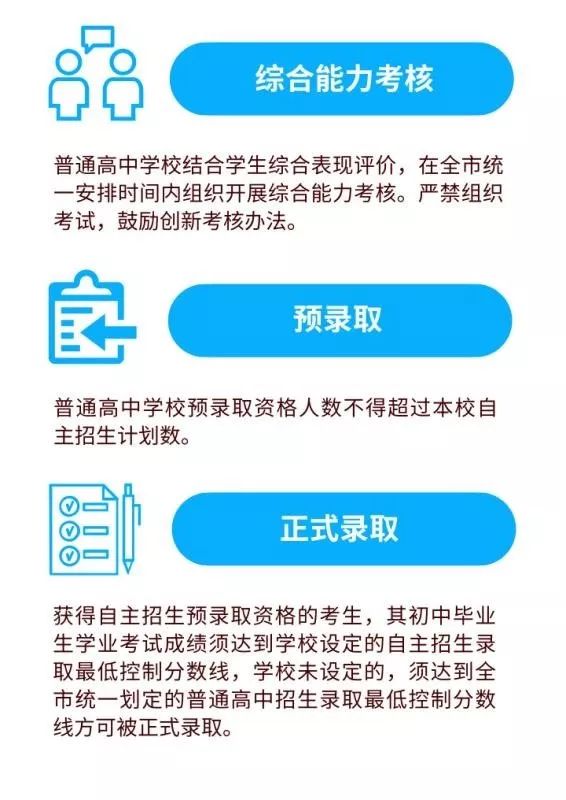 实施自主招生是深化高中阶段学校考试招生制度改革的重要举措,公平公正是自主招生必须遵循的原则,除了严格规范自主招生程序外,还从三个方面强化监管:一是加强组织管理,普通高中学校要成立工作机构、明确招生办法、统一选拔条件、规范实施操作。二是做好信息公开,切实做到招生方案公开、实施过程公开、录取结果公开。三是强化监督检查,做到“八个严禁”,即严禁采取考试方式选拔学生;严禁借助社会团体、培训机构等组织通过考试、竞赛、培训、测试排名等形式选拔学生;严禁参与社会团体、培训机构等组织举办的与自主招生相关的讲座、宣传等活动;严禁不按照规定的时间进行招生;严禁不按要求提前发布自主招生简章、广告等信息;严禁干预学生自主填报志愿;严禁超计划招生;严禁招生乱收费和有偿招生。经核实确认学校存在上述违规行为,或发生其他干扰招生工作秩序、影响教育教学行为的,将依法依规严肃查处,视情节严重程度给予约谈、通报批评、追究相关人员责任、责令限期整改、扣减当年或下一年度自主招生计划直至取消自主招生资格的处罚。市、区和各校要畅通违纪举报和申诉受理渠道,接受考生、学校和社会的监督,提高自主招生的公信力。