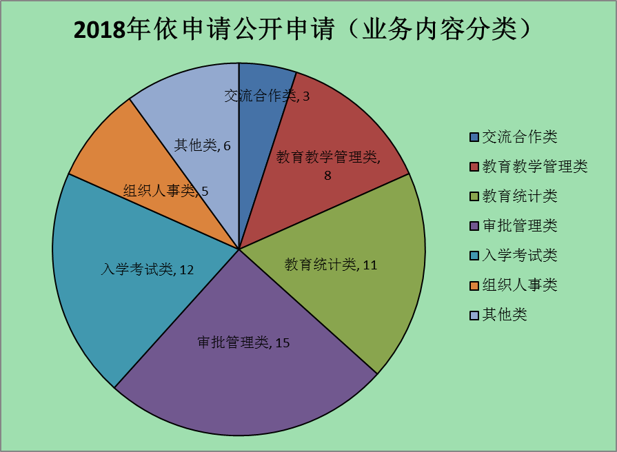 市教育局共收到信息公开申请60宗,全部为网上申请途径,占100%。其中,按申请对象分类统计:单位申请4宗,占7%;个人申请56宗,占93%。按业务内容分类统计:交流合作类3宗,占5%;教育教学管理类8宗,占13.3%;教育统计类11宗,占18.4%;审批管理类15宗,占25%;入学考试类12宗,占20%;组织人事类5宗,占8.3%;其他类6宗,占10%。
