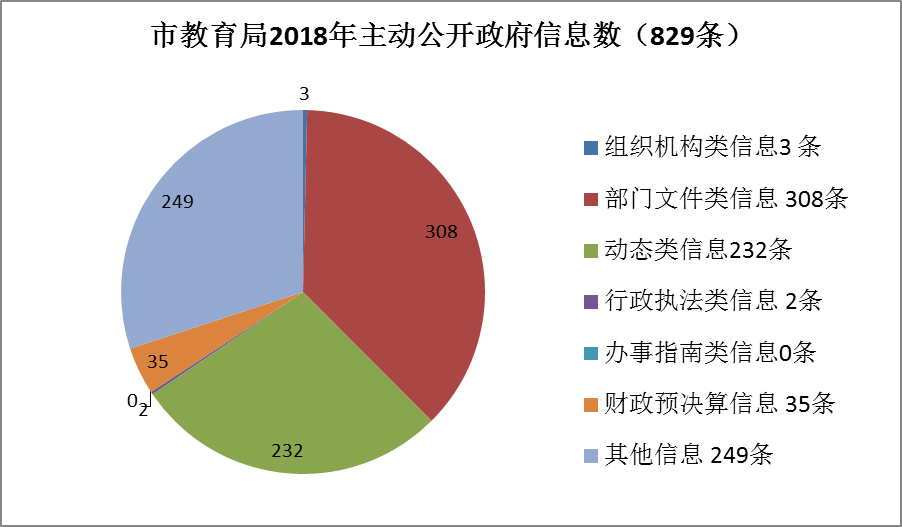 市教育局主动公开政府信息829条,其中:1.组织机构类信息3条;2.部门文件类信息308条;3.动态类信息232条;4.行政执法类信息2条;5.办事指南类信息0条;6.财政预决算信息35条;7.其他信息249条。