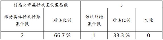 市教育局信息公开类行政复议案件3宗。其中,维持具体行政行为的2宗,占66.7%;依法纠错的1宗,占33.3%;其他情形0宗,占0%。