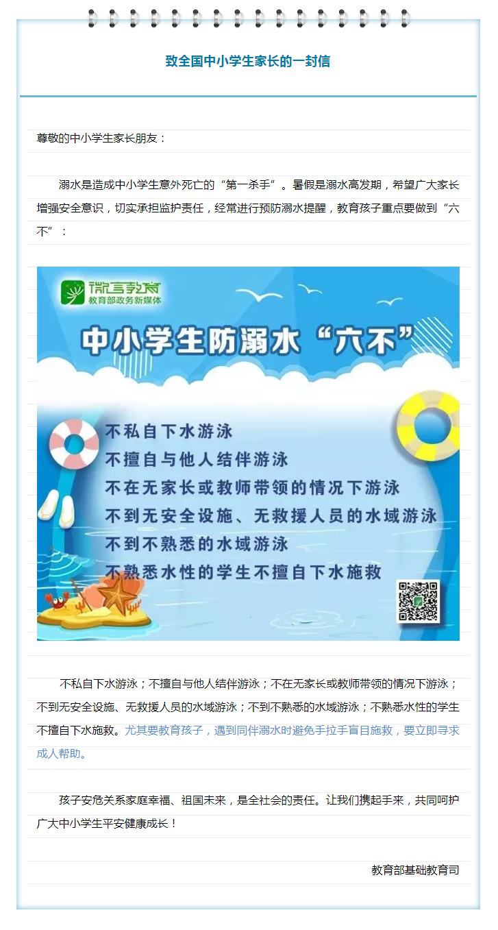 教育部还发出《致全国中小学生家长的一封信》,提醒家长要经常对孩子进行预防溺水提醒。
