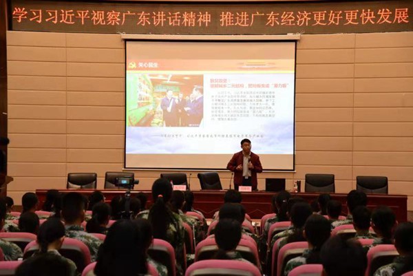 11月27日下午,广州科技贸易职业学院邀请了广东省职业技术教育学会、广东省高校思想政治教育研究会副秘书长刘苍劲教授,在行政楼学术报告厅给学院国旗护卫队、学生党员、学院第五期学生入党发展对象共300多名学生作题为《学习习近平总书记视察广东重要讲话精神,推进广东经济更好更快发展》的专题宣讲。报告会由学院党委委员、副院长朱志坚教授主持。主会场设在学术报告厅,同时,通过网络视频形式向萝岗的产业学院学生党员、学生入党发展对象进行同步直播。