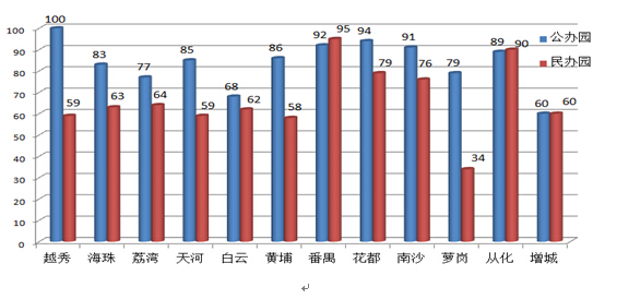 3.依法遵章,规范管理,促进幼儿园健康发展。各区(县级市)采取强有力措施,严格规范幼儿园的管理行为。一是严把新园开办关,要求新开办的幼儿园其办园条件必须达到规范化幼儿园的标准。花都区实行民办园办学风险金制度,要求办学者在指定专项帐户储存20万元,由教育局、办学者、银行三方监管。二是落实幼儿园年检制度,坚决消除无证办园现象。不少区(县级市)成立了由各职能部门组成的整治无证办园执法机构,积极稳妥清理整治无证办园,其中,天河区取缔无证办园达41所。三是以规范化幼儿园建设为抓手,引导幼儿园自觉按照规范要求进行办园。从化市规定申报普惠性幼儿园必须首先成为规范化幼儿园,促使幼儿园提高规范管理的水平。增城市统一制定“幼儿园规章制度目录”,引导各园结合实际制定切实可行的规章制度,依法办园。四是加强常规检查和督导工作。海珠区建立了每三年对各类幼儿园进行综合督导评估的长效机制。越秀区每年通过联合视导及专项检查,对幼儿园工作进行全方位的监督指导。萝岗、海珠、南沙等区通过责任区督学的常规督导,规范幼儿园的办园行为。五是重视幼儿园安全工作,消除安全隐患。萝岗区财政划拨专款,为全区公办园统一配备专职保安员。目前,全市大部分幼儿园做到各类证照齐全,章程制度健全,收费规范,并按要求为教职工购买社会保险,依法规范办园的格局基本形成。