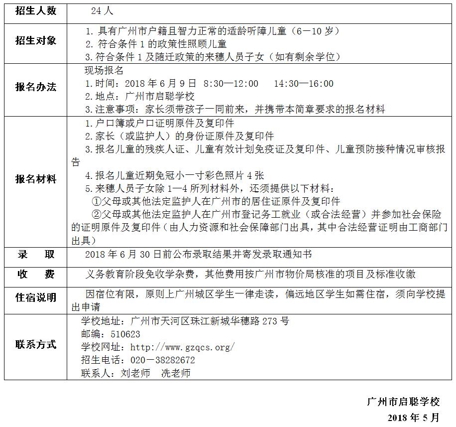 有关规定,结合学校实际情况,广州市启聪学校2018年小学一年级招生办法如下:
