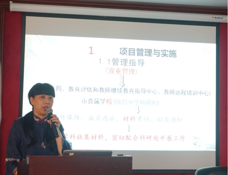 市教育评估中心行政负责人邓静红总结2018年专项培训绩效验收工作,对2019年专项培训的组织实施和2020年专项培训项目申报提出了工作要求,一是贯彻新政,确保方向;二是以师为本,顶层设计;三是关注课堂,创新方式;四是加强调研,提高质量;五是依规编制,厉行节约。