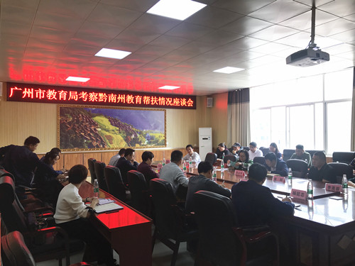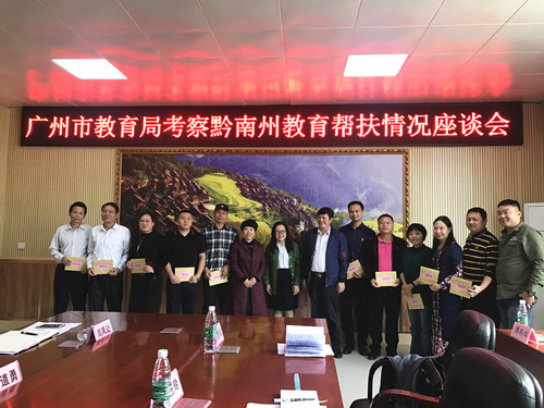 为推动深度贫困地区教育扶贫,10月29日上午,市教育局副巡视员陈聪一行深入黔南州深度贫困县三都县民族中学调研了解学校示范校建设工作的推进情况和存在的困难。下午,在三都县召开了推进教育帮扶工作座谈会。会上,黔南州教育局党组成员、副局长、三都县教育局局长韦快同志介绍了黔南州以及三都县教育发展的基本情况,双方围绕教育帮扶提需求和意见,广州在黔南州挂职的3名教务工作者交流了挂职帮扶经验。陈聪副巡视员对挂职校长的工作表示充分肯定并进行慰问,强调教育帮扶工作要在以下五个方面下功夫:一是要在示范学校创建上下功夫;二是要在规范建设上下功夫;三是要在队伍引领上下功夫;四是要在信息化发展上下功夫;五是在健康教育上下功夫。